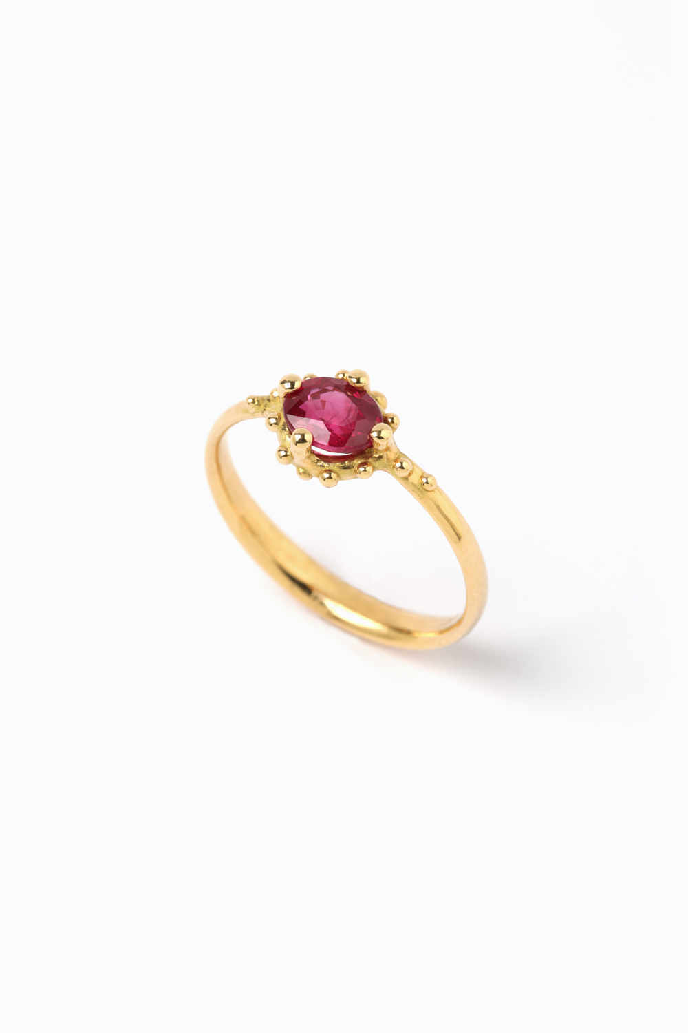 This unique ring features a 0.8ct ruby, accented with Sarah Cossham’s signature bubble embellishments in 18k recycled gold.