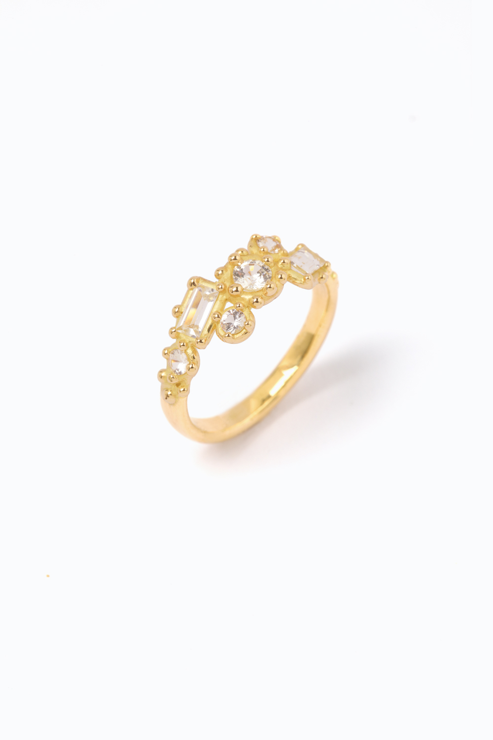 This one-of-a-kind ring features an asymmetric arrangement of white sapphires in round and baguette cuts, set in 18k recycled gold.