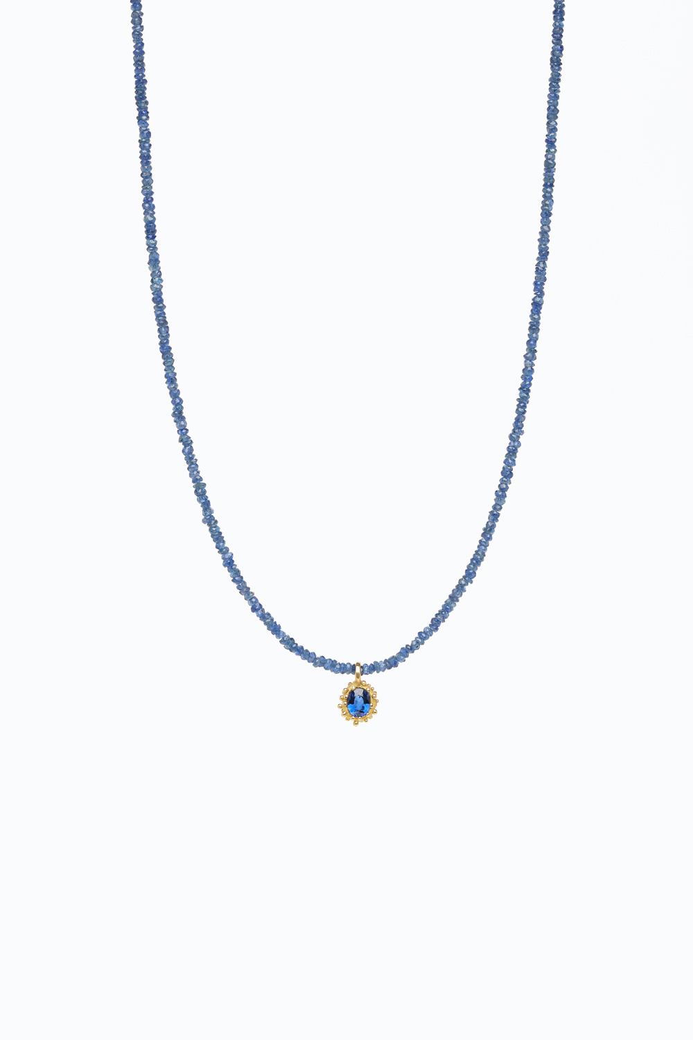 A 0.92ct cornflower blue sapphire cast in place on a necklace of faceted blue sapphire beads. Handcrafted by Sarah Cossham and one of a kind.