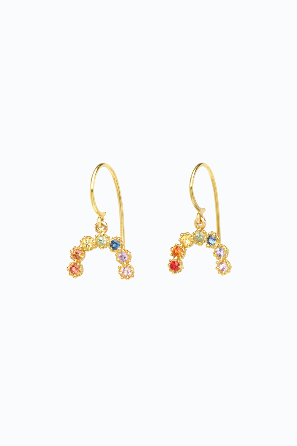 Adorned with 0.68 carats of vibrant sapphires, these earrings feature a gradient design that mirrors the colors of a rainbow.