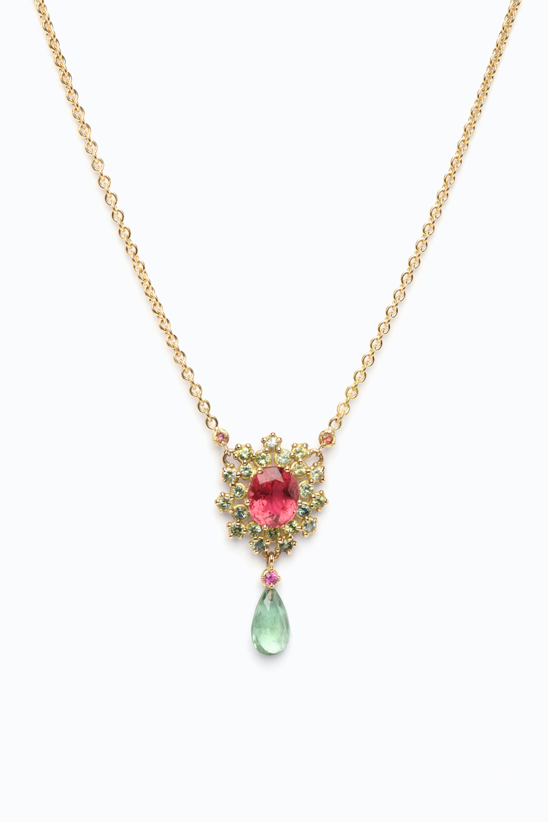 1.90ct. sapphire, 2.2ct. pink tourmaline, 1.40ct. drop tourmaline