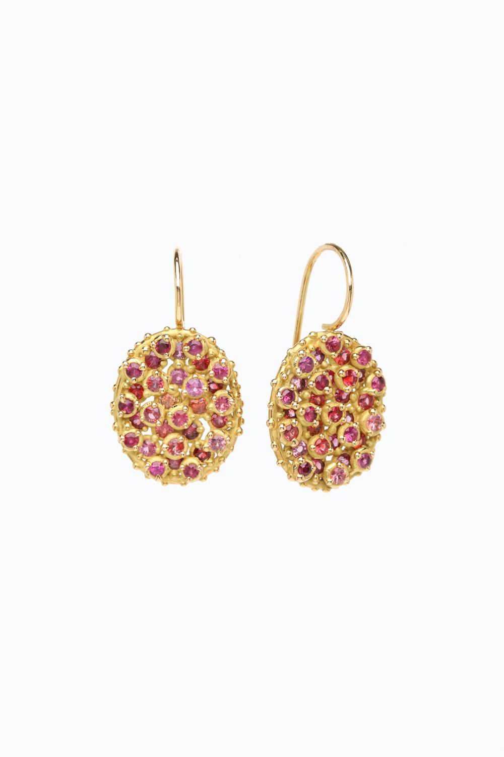 These earrings in an oval shape feature a bouquet of pink, purple and apricot sapphires. Each piece is handcrafted by Sarah Cossham and one of a kind.