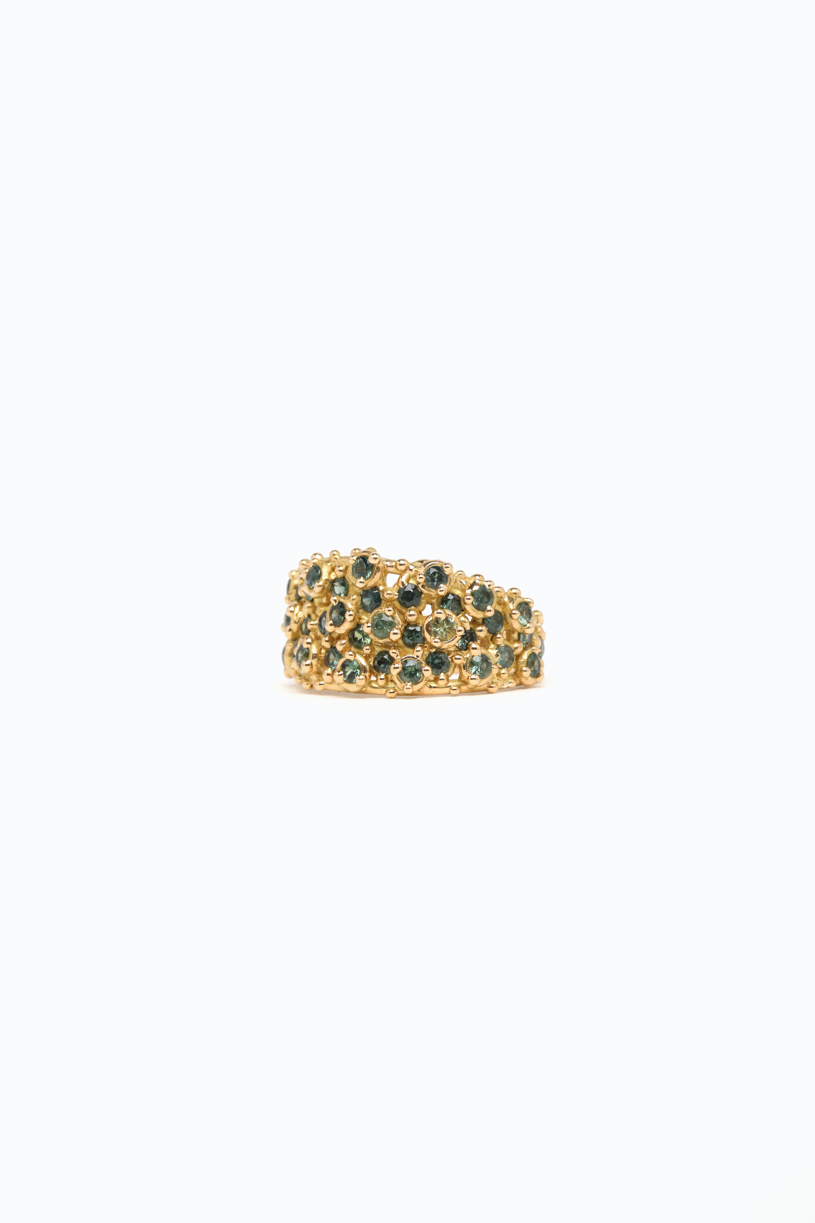 A 2ct sapphires in a rich teal colour, cast in place in 18k recycled gold.