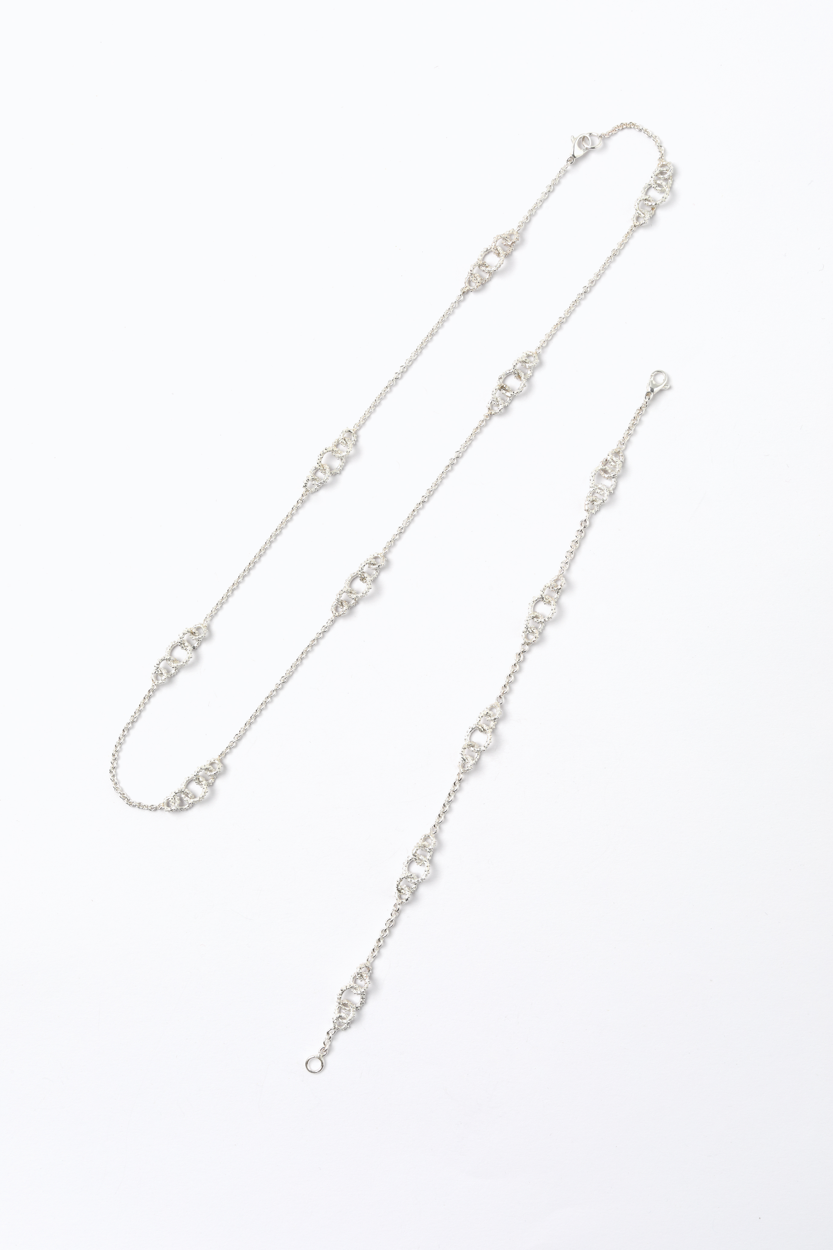 Ineinander verschlungene Gold- oder Silberglieder, vollständig aus recyceltem Material gefertigt und mit Sarah Cosshams charakteristischer Textur aus feinen Champagnerperlen.