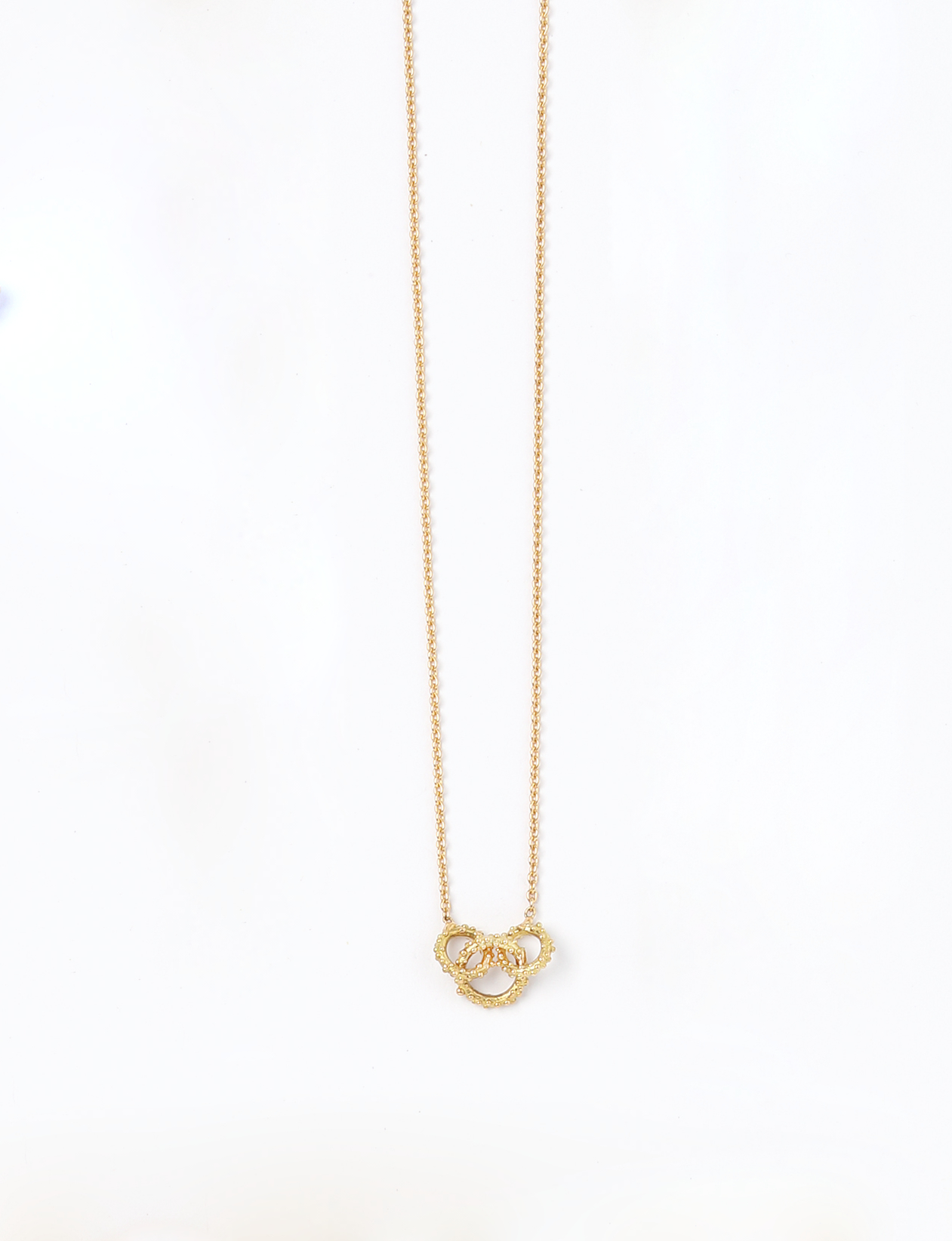 Drei ineinander verschlungene Goldglieder, vollständig aus recyceltem Gold (18kt.) gefertigt und mit Sarah Cosshams charakteristischer Textur aus feinen Champagnerperlen.