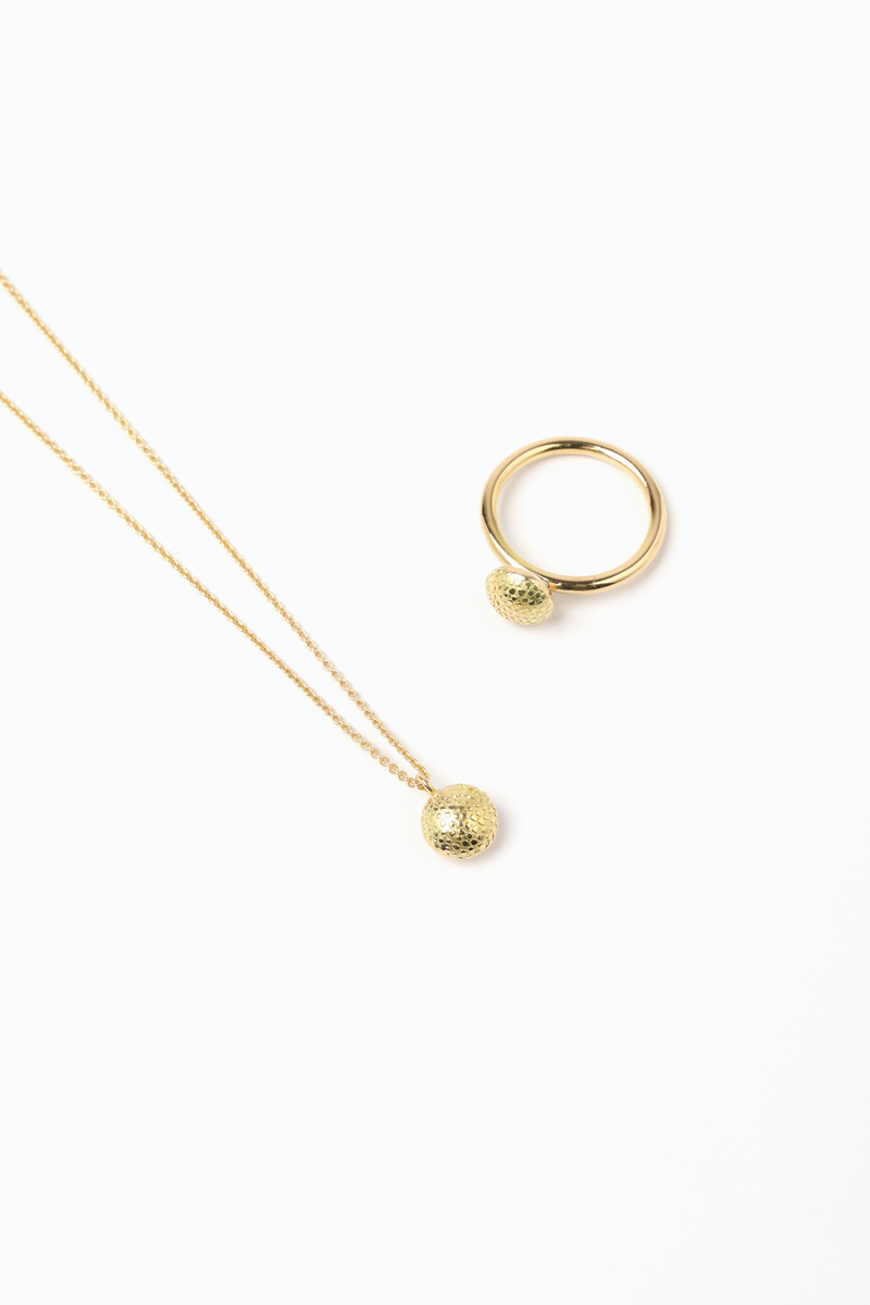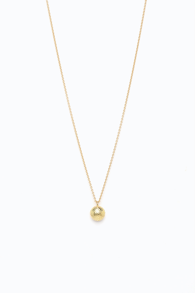 The pendant features Sarah Cossham’s signature champagne bubble texture, which is given a twist through the forging process.