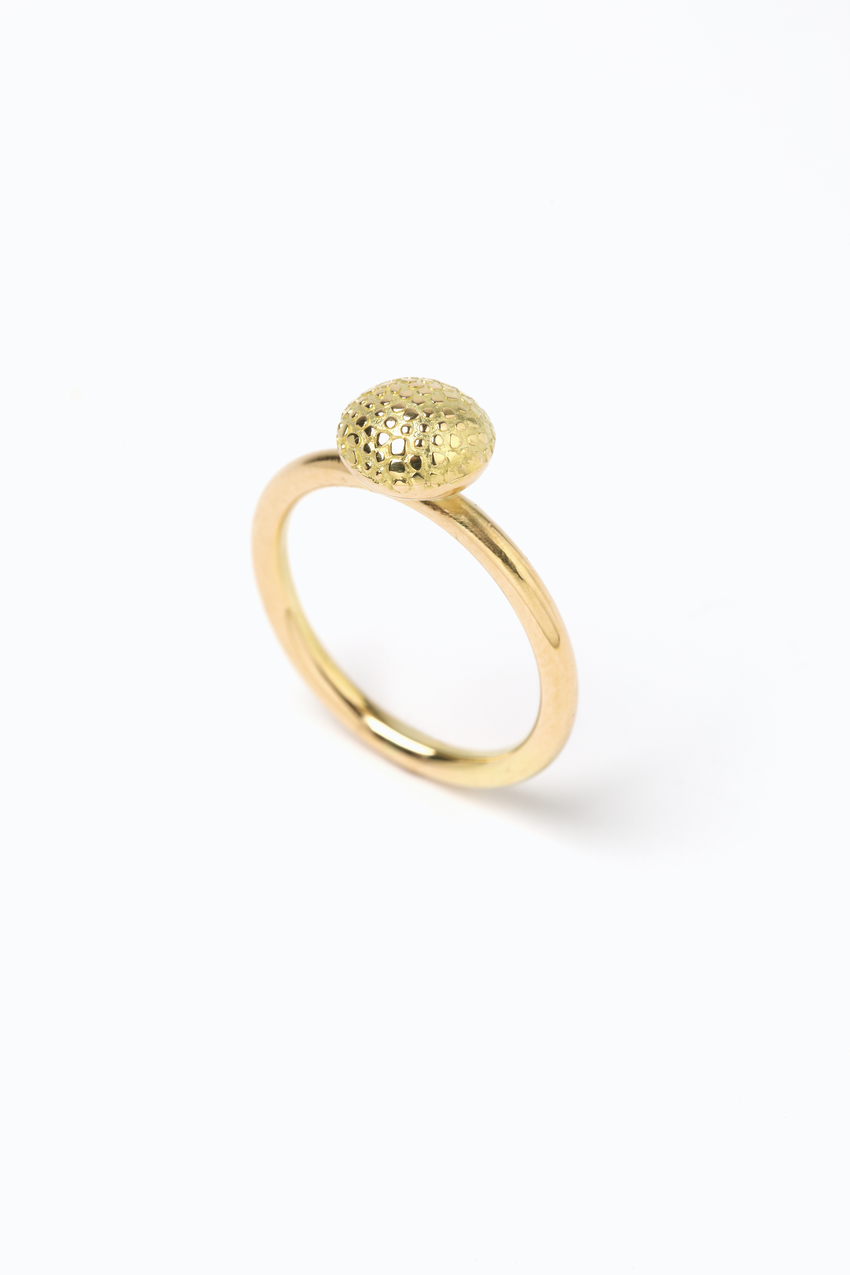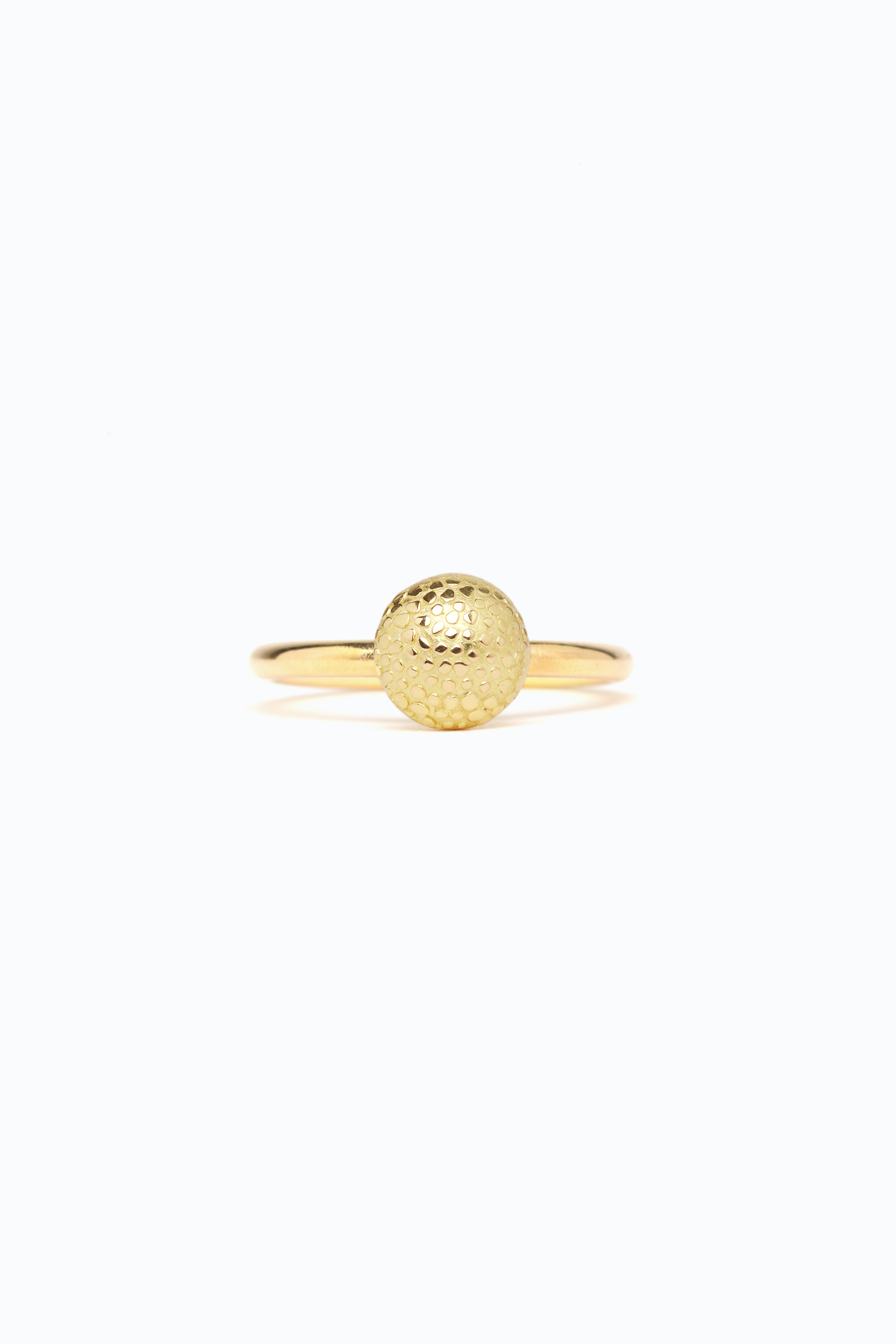 The ring, with its lens-shaped head, features Sarah Cossham’s signature champagne bubble texture, which is given a special touch here by the forging process.