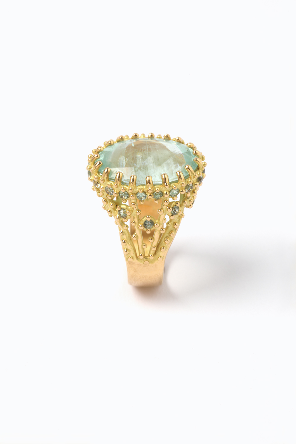 This one-of-a-kind ring features an aquamarine set in 18k recycled gold, surrounded by 1.3ct of light blue sapphires.